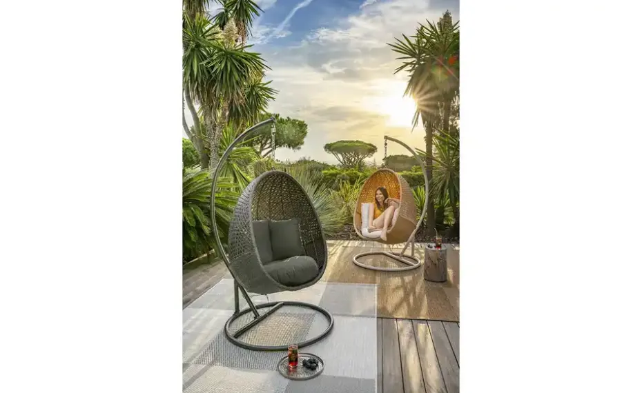 Der Hängesessel Tahiti von a casa mia fasziniert durch seine außergewöhnliche Gestaltung. Er scheint über dem Boden zu schweben, da der halbkugelförmige Sitz an einer Gliederkette an einem Gestell befestigt ist. Dadurch können Sie in dem Sessel sanft schwingen . Das passende Gestell steht auf einem breiten, kreisrunden Standfuß. Ein Sitzkissen gehört zu dem Sessel dazu.