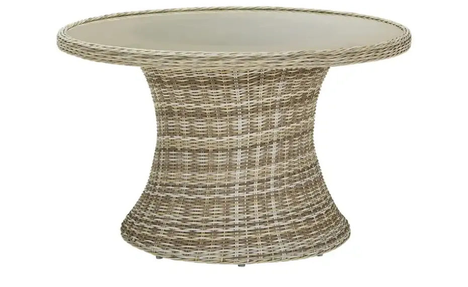 Dieser Tisch ist ideal für den Außenbereich. Er ist aus einem Polyrattangeflecht in einem eleganten Creme-Ton gefertigt. Für einen noch besseren Stand sorgt das Aluminium-Gestell im Inneren des Tisches. Die runde Tischplatte wird mit einer Glasplatte ergänzt. Sie besteht aus Sicherheitsglas, was sich durch seine Stoßfestigkeit und Kratzerunempfindlichkeit auszeichnet. Gleichzeitig lässt sich die Glasfläche besonders leicht reinigen.