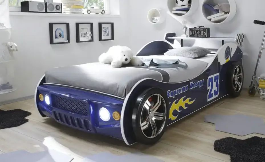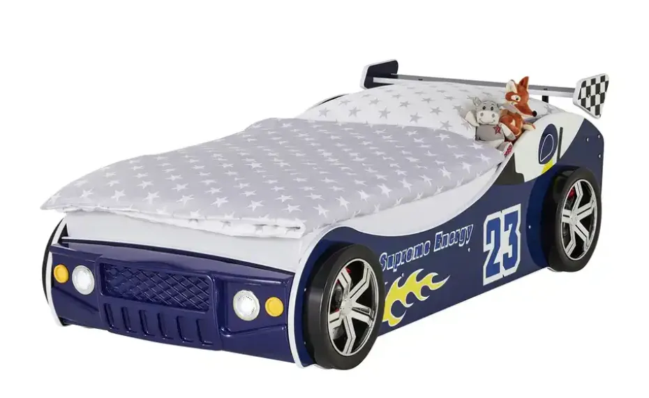 Für kleine Rennfahrer ist das Bettgestell Blue Speed gedacht. Der blaue Flitzer ist richtig mit Reifen ausgestattet – und Licht hat er natürlich auch. Die Seiten sind mit Flammen, dem Schriftzug „Supreme Energy“ und der Zahl 23 bedruckt. Anstelle des Kopfteils hat der Wagen einen coolen Spoiler. Die Liegefläche ist 90 x 200 Zentimeter groß und kann mit handelsüblichem Lattenrost und Matratze ergänzt werden. Beides finden Sie ebenfalls im Onlineshop.