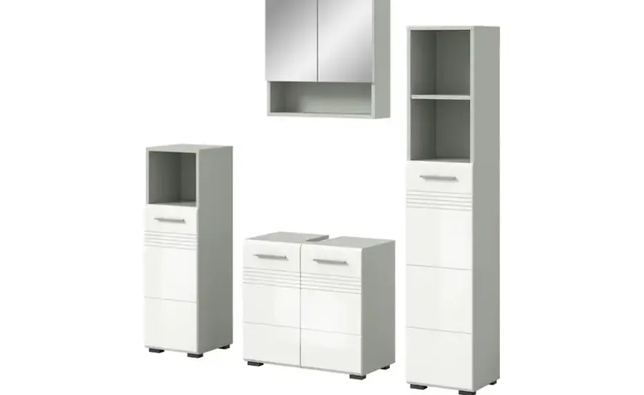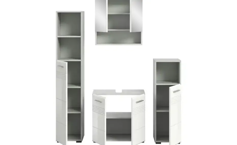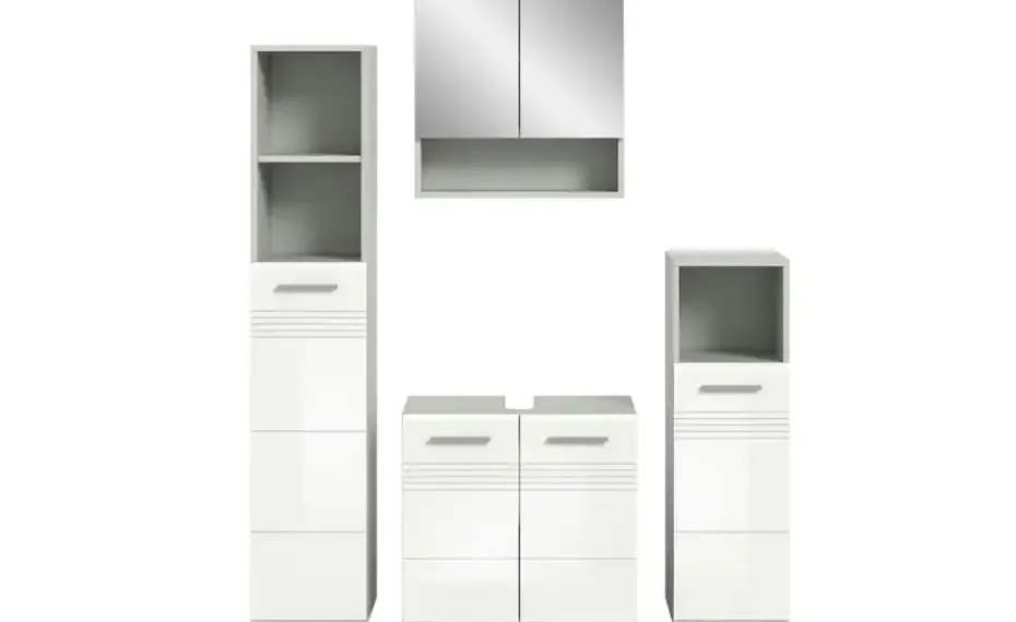 1x Hochschrank, 1x Waschbeckenunterschrank, 1x Spiegelschrank, 1x Standschrank