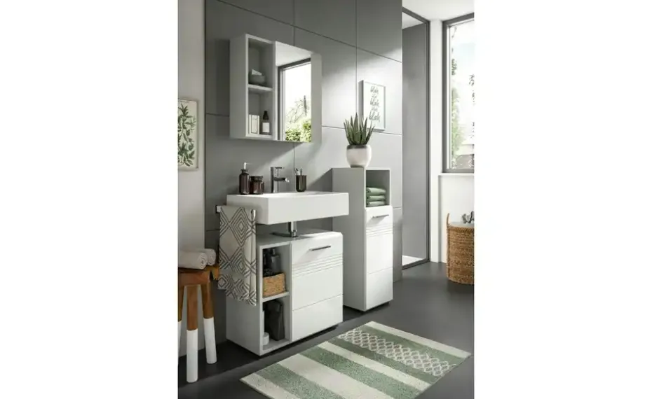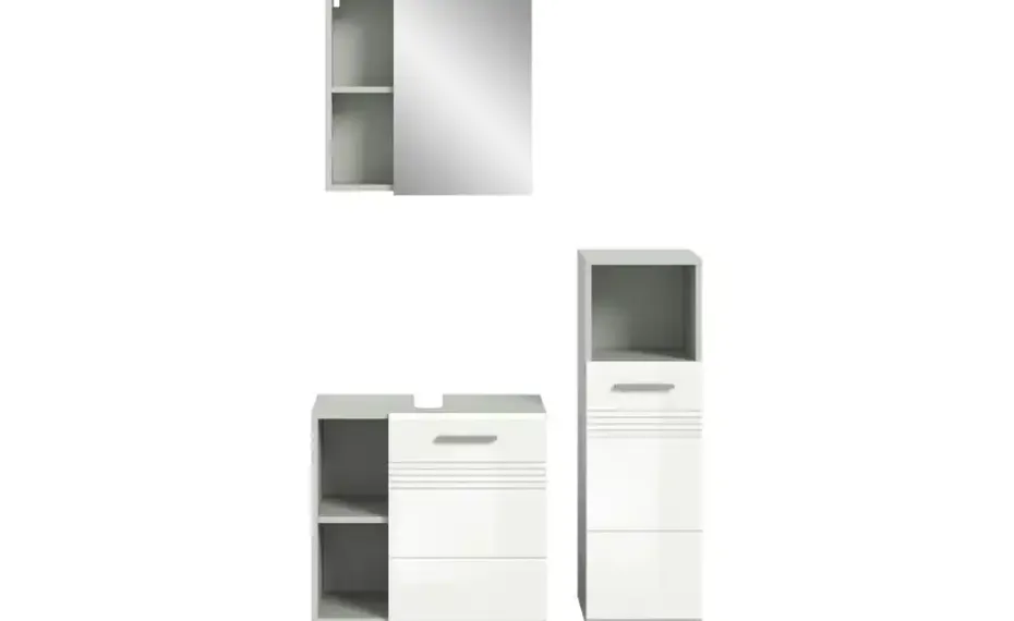1x Waschbeckenunterschrank, 1x Standschrank, 1x Spiegelschrank