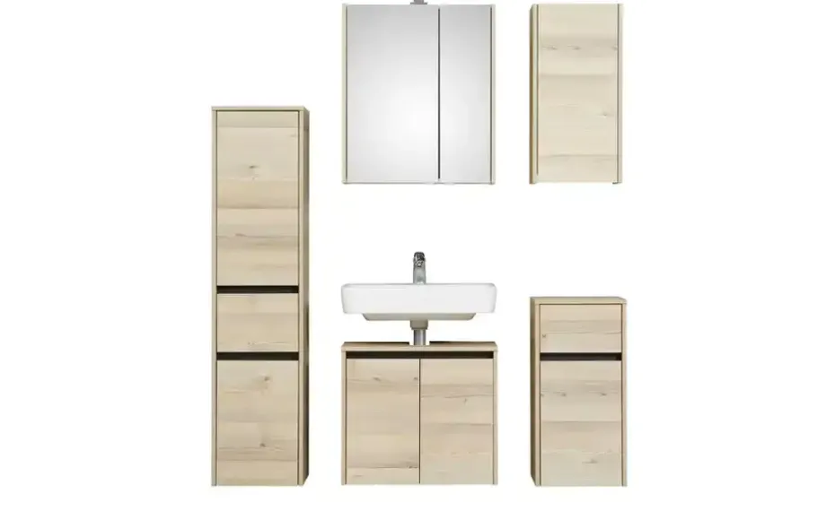 Waschbeckenunterschrank H/B/T 530/600/330mm, Spiegelschrank H/B/T 700/600/205mm, Midischrank H/B/T 1456/350/330mm, Unterschrank H/B/T 717/350/330mm, Hängeschrank H/B/T 700/350/205mm