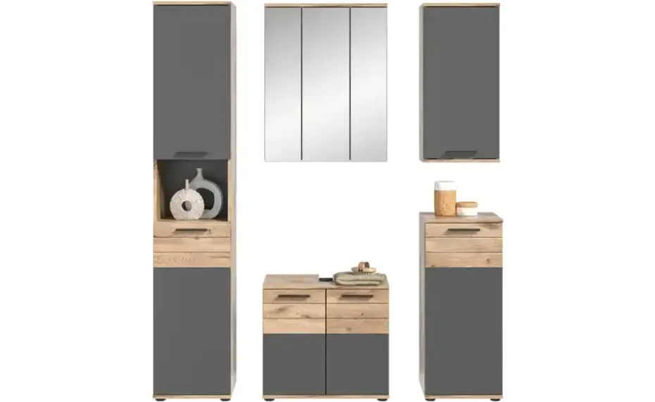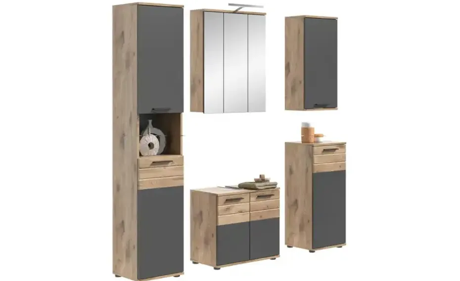 Hochschrank, Waschbeckenunterschrank, Spiegelschrank inkl. Bel., Unterschrank, Hängeschrank