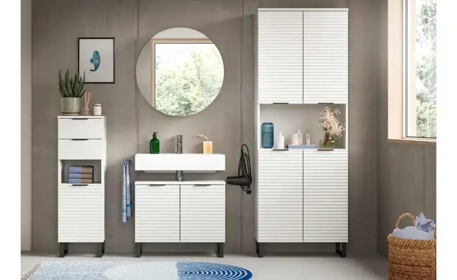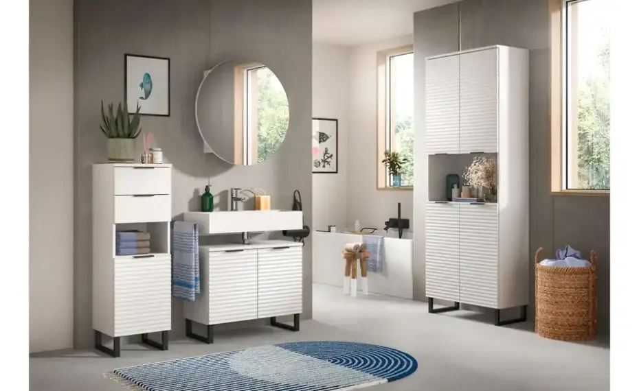 1x Waschbeckenunterschrank, 1x Spiegelschrank, 1x Hochschrank