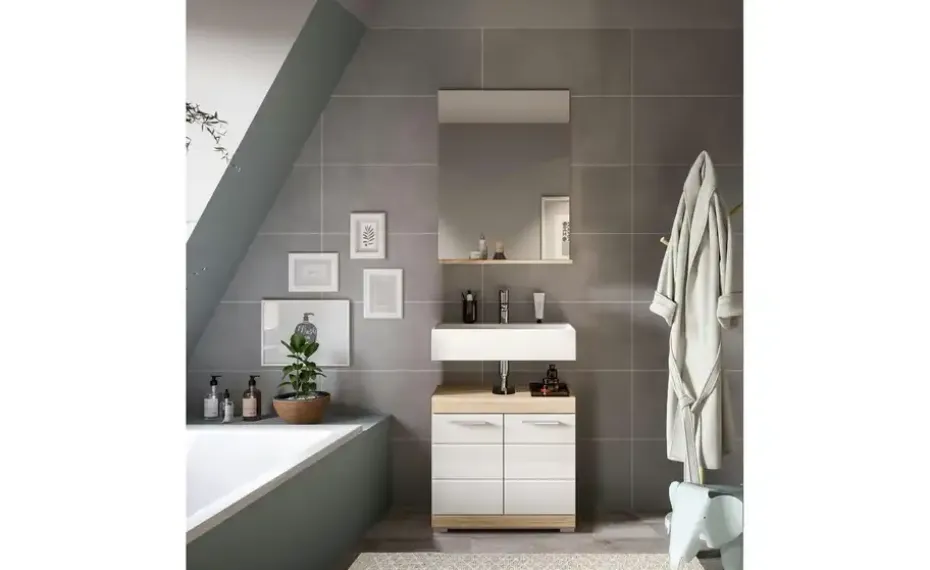 Entdecken Sie die perfekte Kombination aus Stil und Funktionalität für Ihr Badezimmer mit unserer Badkombination in Sonoma Eiche hell und weißem Hochglanz. Sie bietet bietet ausreichend Stauraum und verleiht Ihrem Raum einen modernen und ansprechenden Look. Tauchen Sie ein in zeitlose Eleganz und optimale Organisation mit diesem einzigartigen Möbelstück.