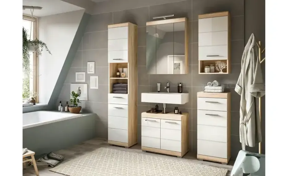 Entdecken Sie die perfekte Kombination aus Stil und Funktionalität für Ihr Badezimmer mit unserer Badkombination in Sonoma Eiche hell und weißem Hochglanz. Sie bietet bietet ausreichend Stauraum und verleiht Ihrem Raum einen modernen und ansprechenden Look. Tauchen Sie ein in zeitlose Eleganz und optimale Organisation mit diesem einzigartigen Möbelstück.