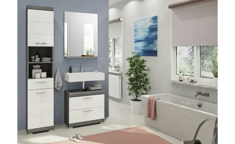 Verleihe deinem Badezimmer den ultimativen Style mit unserer Badkombination in angesagtem Rauchsilber Nachbildung und weißem Hochglanz tiefgezogenem Finish. Mit ihrem trendigen Design und der hochwertigen Verarbeitung setzt sie ein modernes Statement in deinem Zuhause. Entdecke jetzt die perfekte Verbindung von Coolness und Funktionalität für dein Badezimmer!