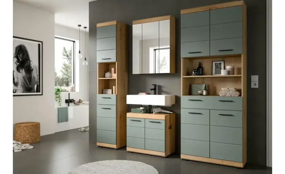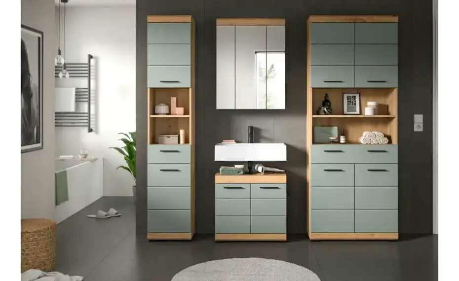 Badmöbel-Set SCHLOONSEE, 4 teilig, bestehend aus: Hochschrank schmal, WBU, Spiegelschrank, Hochschrank breit Schloonsee | Eiche Artisan (Nachbildung), Salbeigrün