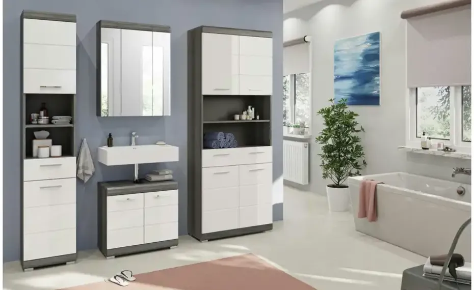 Verleihe deinem Badezimmer den ultimativen Style mit unserer Badkombination in angesagtem Rauchsilber Nachbildung und weißem Hochglanz tiefgezogenem Finish. Mit ihrem trendigen Design und der hochwertigen Verarbeitung setzt sie ein modernes Statement in deinem Zuhause. Entdecke jetzt die perfekte Verbindung von Coolness und Funktionalität für dein Badezimmer!