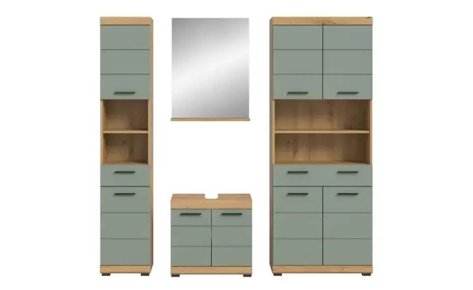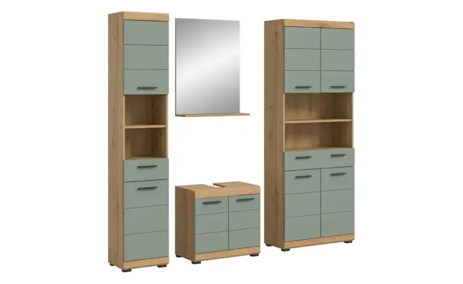 Badmöbel-Set SCHLOONSEE, 4 teilig, bestehend aus: Hochschrank, Waschbeckenunterschrank, Badspiegel, Hochschrank breit Schloonsee | Eiche Artisan (Nachbildung), Salbeigrün