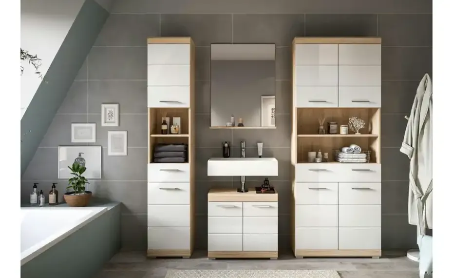 Entdecken Sie die perfekte Kombination aus Stil und Funktionalität für Ihr Badezimmer mit unserer Badkombination in Sonoma Eiche hell und weißem Hochglanz. Sie bietet bietet ausreichend Stauraum und verleiht Ihrem Raum einen modernen und ansprechenden Look. Tauchen Sie ein in zeitlose Eleganz und optimale Organisation mit diesem einzigartigen Möbelstück.
