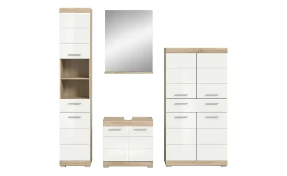 Badmöbel-Set SCHLOONSEE, 4 teilig, bestehend aus: Hochschrank, Waschbeckenunterschrank, Badspiegel, Midischrank Schloonsee | Eiche Sonoma (Nachbildung), Weiß, hochglanz
