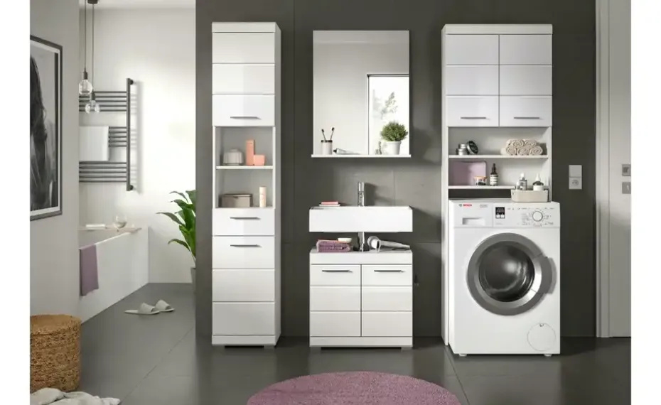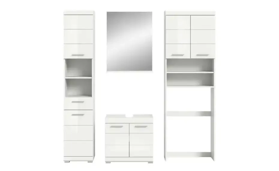 Badmöbel-Set SCHLOONSEE, 4 teilig, bestehend aus: Hochschrank, WBU, Badspiegel, Waschmaschinenumbauschrank Schloonsee | Weiß, hochglanz