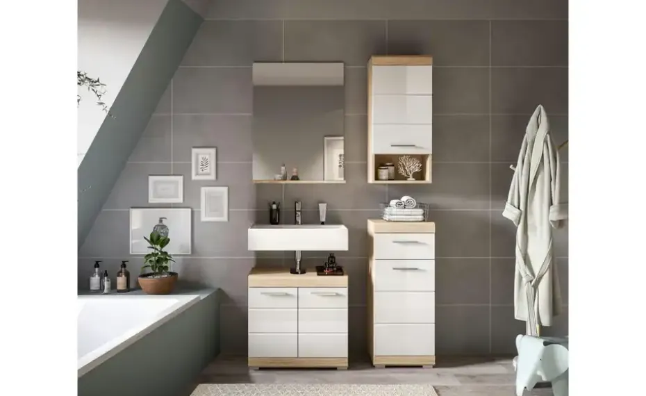 Entdecken Sie die perfekte Kombination aus Stil und Funktionalität für Ihr Badezimmer mit unserer Badkombination in Sonoma Eiche hell und weißem Hochglanz. Sie bietet bietet ausreichend Stauraum und verleiht Ihrem Raum einen modernen und ansprechenden Look. Tauchen Sie ein in zeitlose Eleganz und optimale Organisation mit diesem einzigartigen Möbelstück.