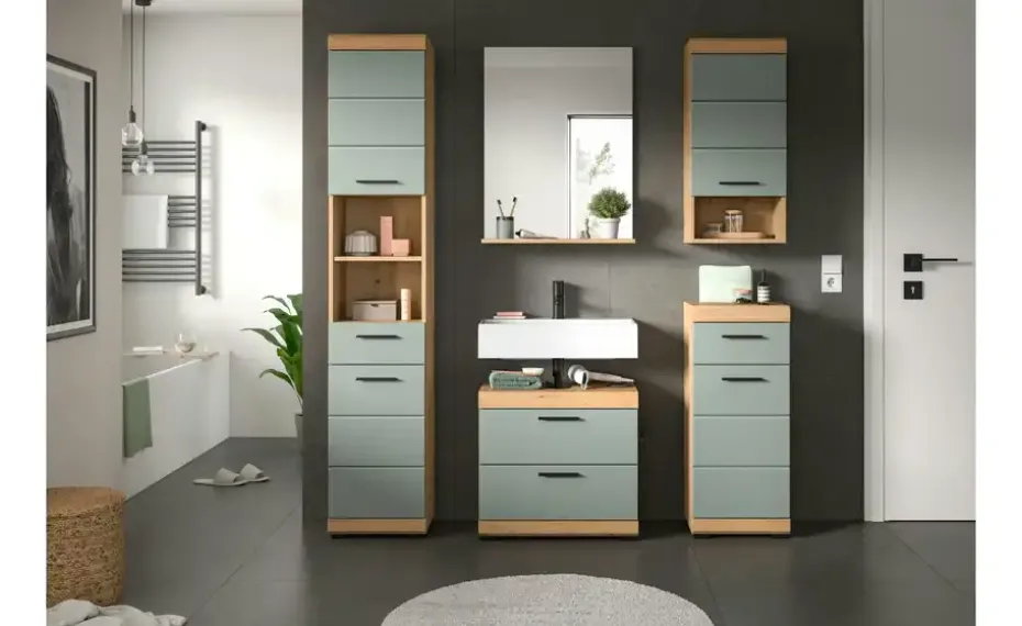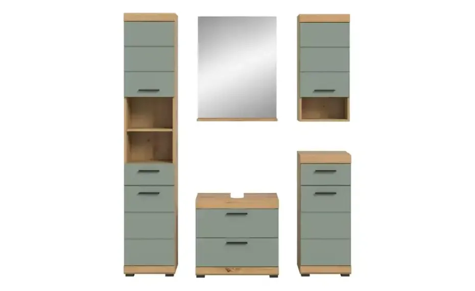 Badmöbel-Set SCHLOONSEE, 5 teilig, bestehend aus: Hochschrank, WBU, Spiegel, Unterschrank, Hängeschrank Schloonsee | Eiche Artisan (Nachbildung), Salbeigrün