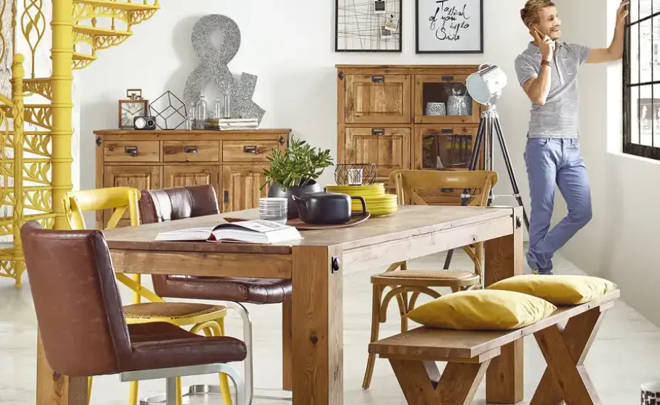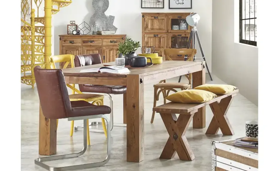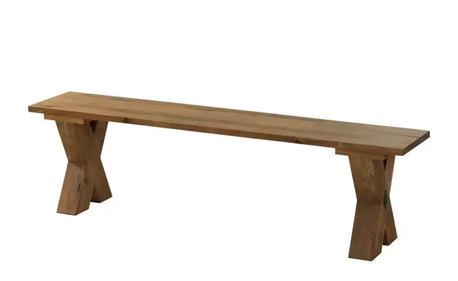 Die Bank Freddy passt ideal zum Esstisch der gleichnamigen Serie, kann aber auch alleinstehend ein Highlight sein. Freddy können Sie ebenso als zusätzliche Sitzgelegenheit in der Küche, im Wohnraum oder sogar im Flur nutzen. Ddie Oberfläche wurde geölt. Durch diese Behandlung hat Freddy einen extravaganten Antik-Look erhalten. Auffällig ist auch die natürliche Maserung des Holzes mit Unebenheiten und Farbverläufen. Sie macht jede Bank zum Einzelstück. Am gekreuzten Gestell sind auf jeder Seite Absetzungen aus Eisen zu finden. Diese unterstützen den rustikalen Gesamteindruck.