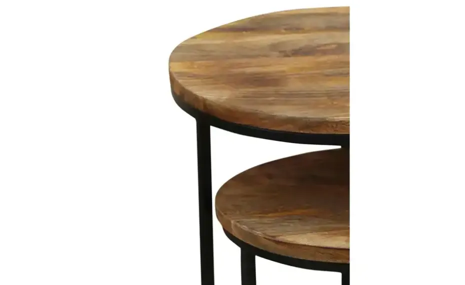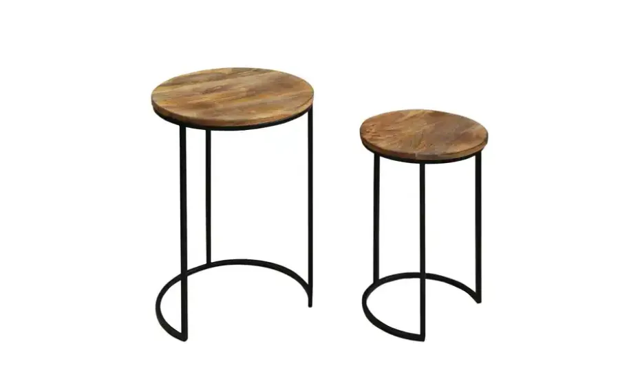 Dieses Beistelltisch-Zweierset ist praktisch, flexibel platzierbar und modern. Die schwarzen Metallgestelle sind halbmondförmig und minimalistisch gehalten. Durch die Formgebung lässt sich der kleinere der beiden Tische bei Bedarf direkt unter den größeren Tisch stellen. Die beiden runden Tischplatten sind aus Mango-Massivholz und erzeugen zusammen mit dem schwarzen Metallgestell eine Industrial-Note.