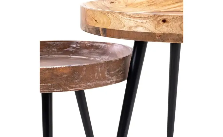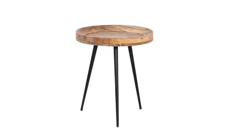Massives, natürliches Mangoholz und schwarzes Metall: Dieser praktische Beistelltisch passt zu modernen und loftigen Einrichtungsstilen. Die Tischplatte bietet mit ihren 45 Zentimetern Durchmesser viel Platz für Lektüre oder den morgendlichen Kaffee. Dank des 5 Zentimeter hohen Rands rutscht nichts so schnell runter.