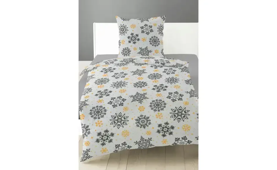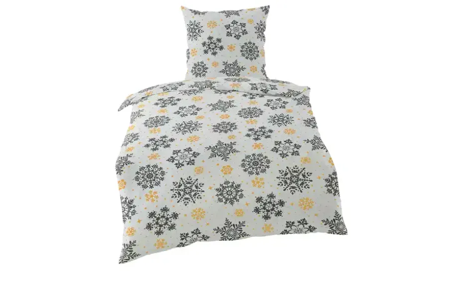 Diese winterliche Bettwäsche besteht zu 100 % aus reiner Baumwolle und ist perfekt für die kalte Jahreszeit. Der 135 x 200 Zentimeter große Bettbezug ist mit einem modernen Schneeflockenmuster in Grau und Gelb versehen. Der 80 x 80 Zentimeter große Kissenbezug greift das Design auf und bringt vorweihnachtliches Flair in Ihr Schlafzimmer.