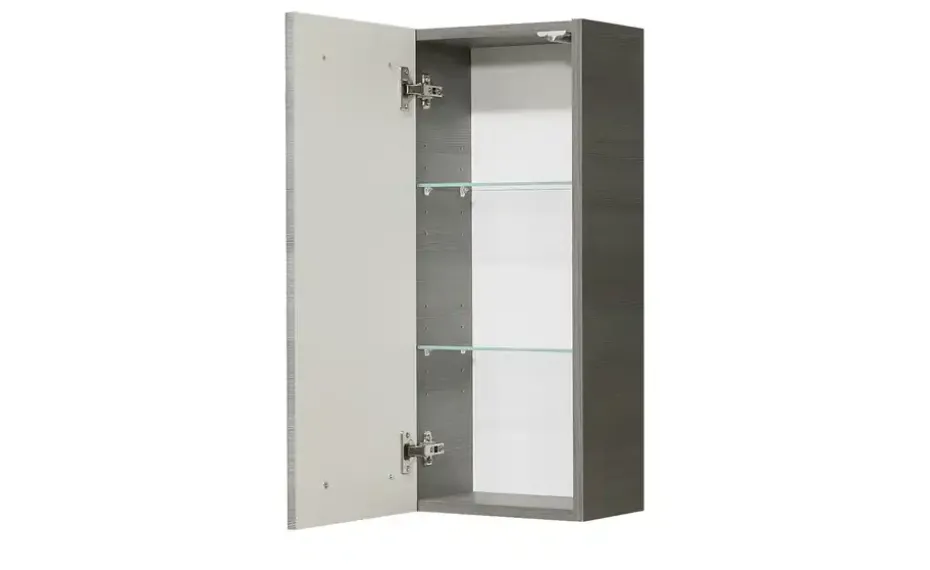 Ob oberhalb des Bad-Unterschrankes oder alleine, der Bad-Wandschrank Alba macht eine gute Figur. Er ist gradlinig und modern designt und hat eine schön strukturierte Graphit-Optik. Hinter der Tür – die dank des Dämpfers leise schließt – befinden sich drei Fächer. Die Glasböden sind individuell verstellbar.