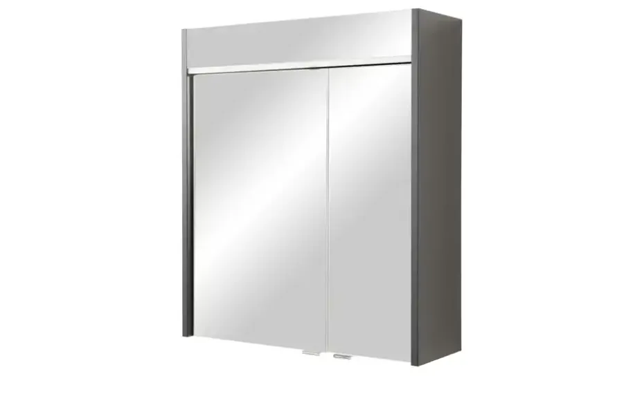 Stauraum und eine große Spiegelfläche bietet Ihnen der Spiegelschrank Valetto. Beide Türen sind mit einem Kristallspiegel versehen. Besonders praktisch bei der täglichen Pflege. Damit Sie sich dabei noch besser sehen können, ist Valetto mit einer LED-Beleuchtung ausgestattet. Diese können Sie durch den Schalter im Inneren des Schrankes anschalten. Direkt daneben befindet sich außerdem eine Steckdose, die Sie für Rasierer oder Fön nutzen können. Der Schrank hat drei geräumige Fächer, in denen Kosmetika und Pflegeprodukte aufbewahrt werden können. Der Korpus des Spiegelschrankes ist in Anthrazit gehalten, so dass Valetto gut zu den anderen Möbeln der Serie passt.