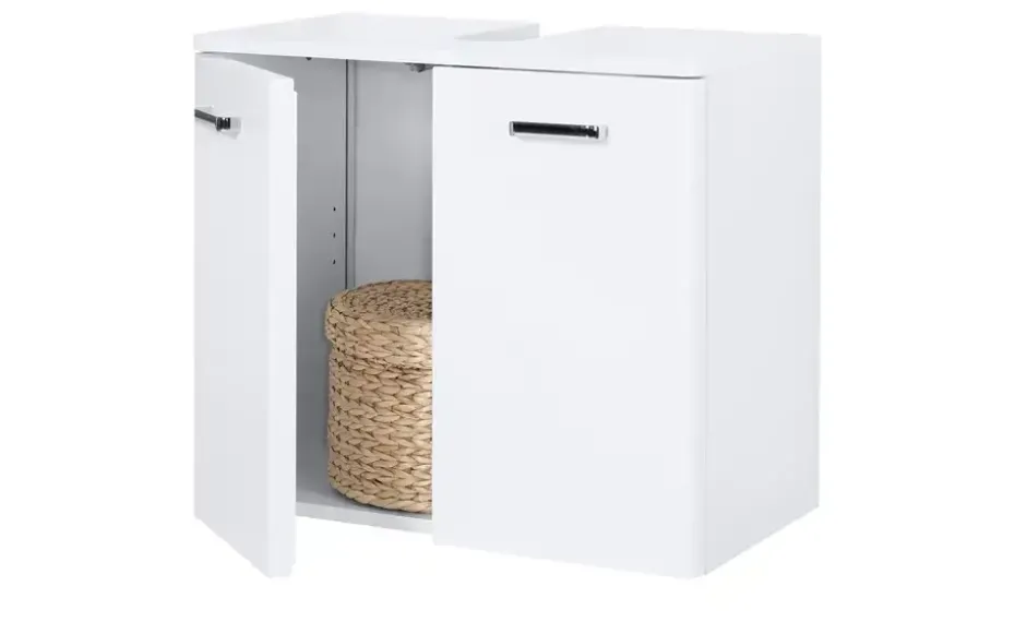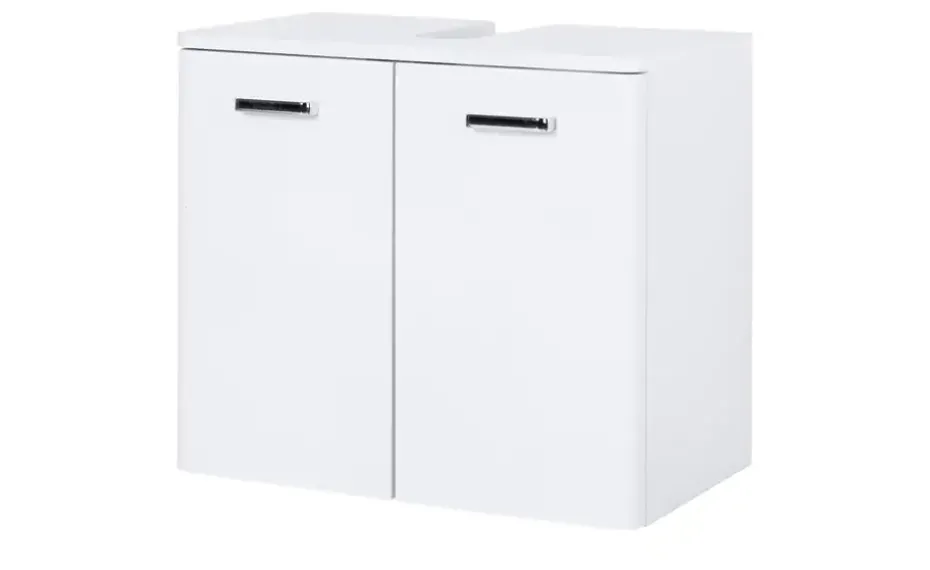 Nutzen Sie den Platz unter Ihrem Waschbecken aus – mit dem Waschbeckenunterschrank Pina. Er bietet Ihnen Staumöglichkeiten hinter den beiden Drehtüren. Die Abdeckplatte oben hat einen Syphonausschnitt. So stört das Abflussrohr des Waschbeckens nicht. Pina ist elegant designt und hat ein stilvolles Weiß. Der Farbton wird durch die Hochglanzoptik in Szene gesetzt. Für weitere Akzente sorgen die Bügelgriffe in Chromoptik.