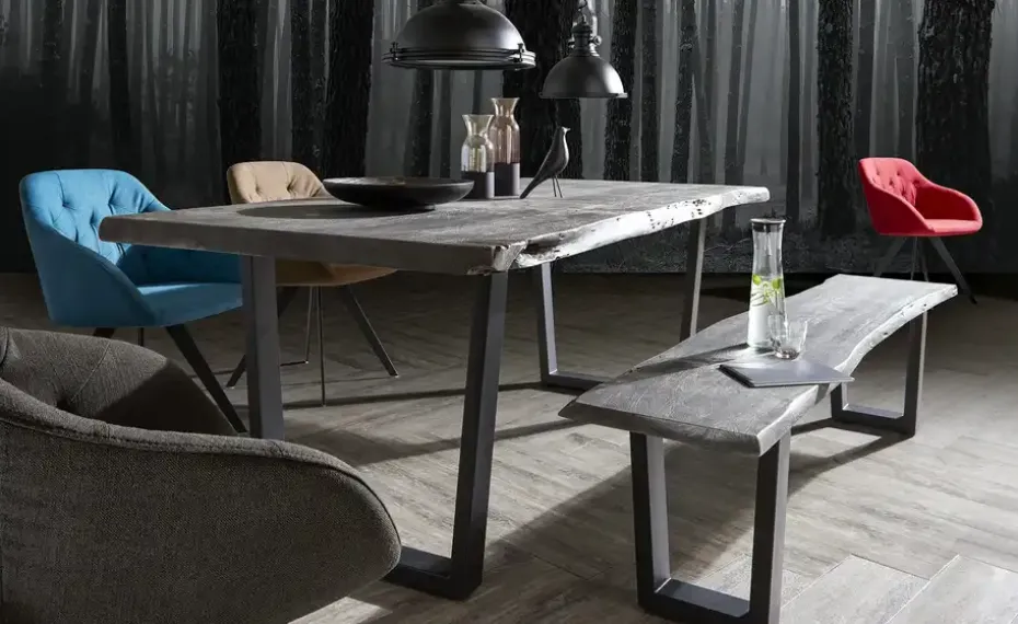 Warum sollte es immer ein Stuhl sein? Bänke sind eine tolle Alternative. Zum Beispiel die Bank Alabria von Woodford. Mindestens drei Personen können gleichzeitig auf ihr sitzen. Die Sitzfläche ist aus massivem Akazienholz gefertigt. Es ist sandgestrahlt und anschließend lackiert worden. Dadurch hat es eine tolle graue Oberfläche erhalten. Die akazienholztypische Maserung ist dennoch wunderbar zu erkennen. Beide Längsseiten verfügen über eine Baumkantenoptik, die die Eyecatche-Akzente setzt. Das Gestell besteht aus lackiertem Metall und besteht aus zwei Kufen in Trapezform.