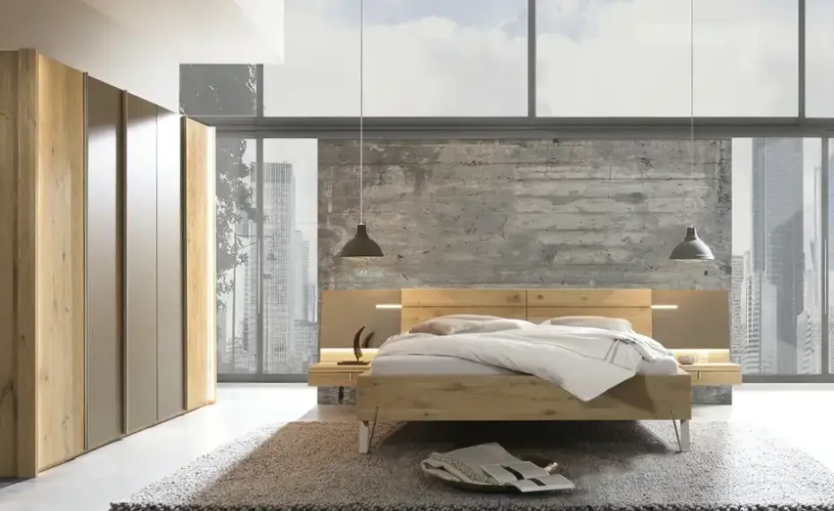 Natürliches Holz und cooler Metallic-Look vereinen sich im Schrank Kaja. Korpus und Teile der Front sind aus massiver Wildeiche Natur gefertigt. Die drei mittigen Türen bestehen aus Parsolglas und haben ein extravagantes Design in Silberbronzeoptik. Ein toller Effekt, der den Schrank zum Eyecatcher macht. Hinter den fünf Türen mit Soft-Close unterteilt sich der Schrank in drei Elemente. Je Element können Sie zwei Einlegeböden und eine Kleiderstange nutzen. Die Böden sind höhenvariabel und können deshalb nach Bedarf verstellt werden.