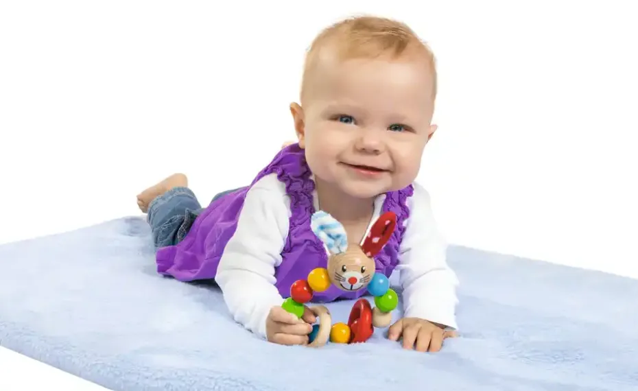Eichhorn Baby, Greifling: Der Eichhorn Baby Greifling besteht aus vielen bunten aneinandergereihten Kugeln und dem süßen Hasenköpfchen. Die zwei großen Ringe klappern wenn der Greifling geschüttelt wird und die plüschigen Ohren des Hasen bieten den Kleinen zusätzlich haptische Reize. Der Eichhorn Baby Greifling ist 9×15,5cm groß und für Kinder ab 3 Monaten geeignet. Für die Herstellung der Eichhorn Babyartikel wird ausschließlich FSC® 100% Holz aus nachhaltiger Forstwirtschaft verwendet.