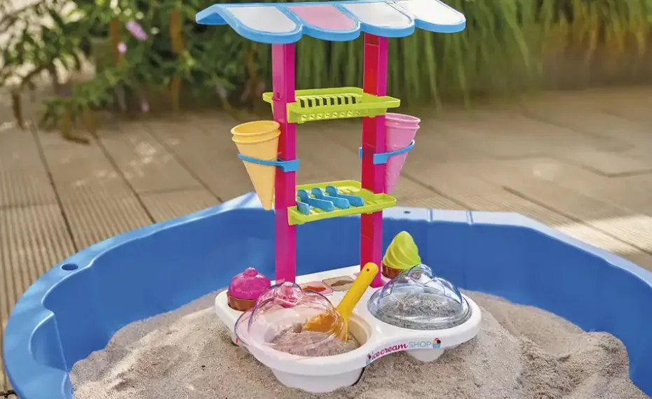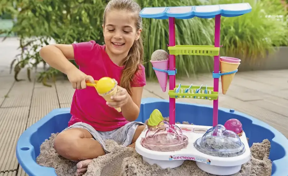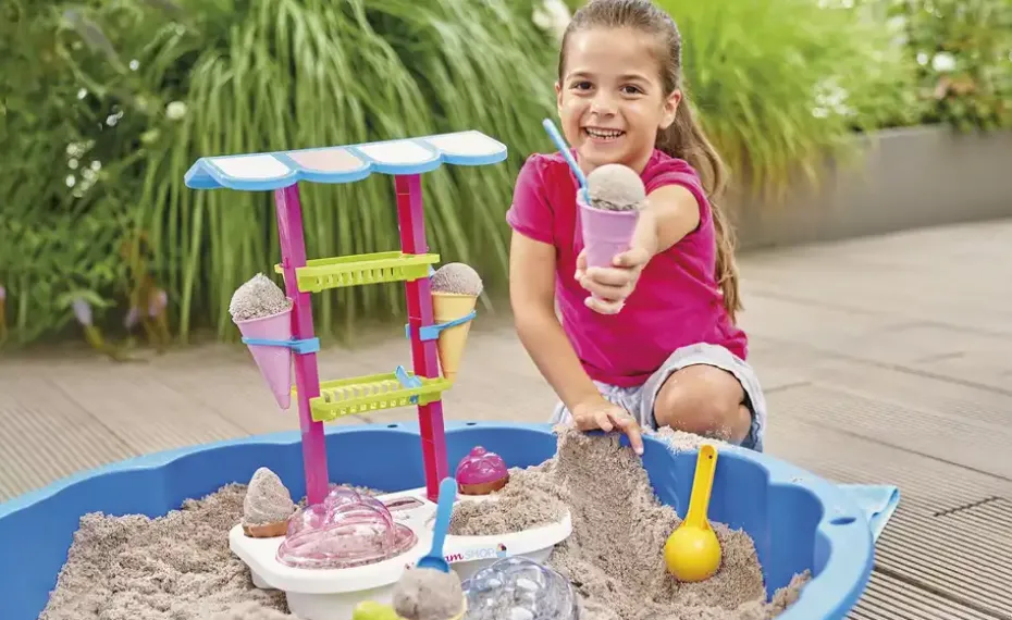 Im Sommer treffen sich alle Kinder an der Sand Eisdiele. Hier gibt es das leckerste Sand-Eis der Stadt. Aus den beiden Behältern mit durchsichtigem Deckel wird der Sand mit dem Eiskugellöffel entnommen und in die Waffeln gedrückt. Neben Eis gibt es hier auch leckere Cup Cakes die mit Hilfe der tollen Formen gemacht werden.