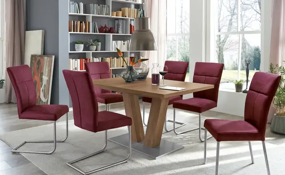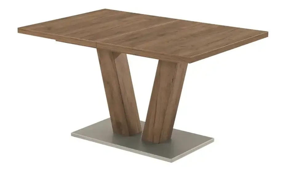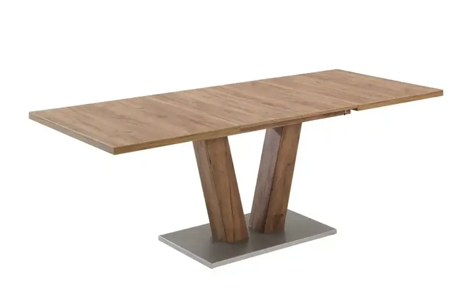 Und plötzlich kommen mehr Gäste als gedacht. Mit dem Esstisch 1063 finden Sie Platz für alle. Der Tisch kann bei Bedarf einfach ausgezogen und mit zwei Platten à 40 cm erweitert werden. So können bis zu zehn Personen bequem an ihm sitzen. Tischplatte und Gestell sind melaminbeschichtet. Das macht die Oberflächen besonders robust und pflegeleicht. Die Holzoptik (Nachbildung) sieht natürlich aus. Ein Eyecatcher ist das Gestell in V-Form.