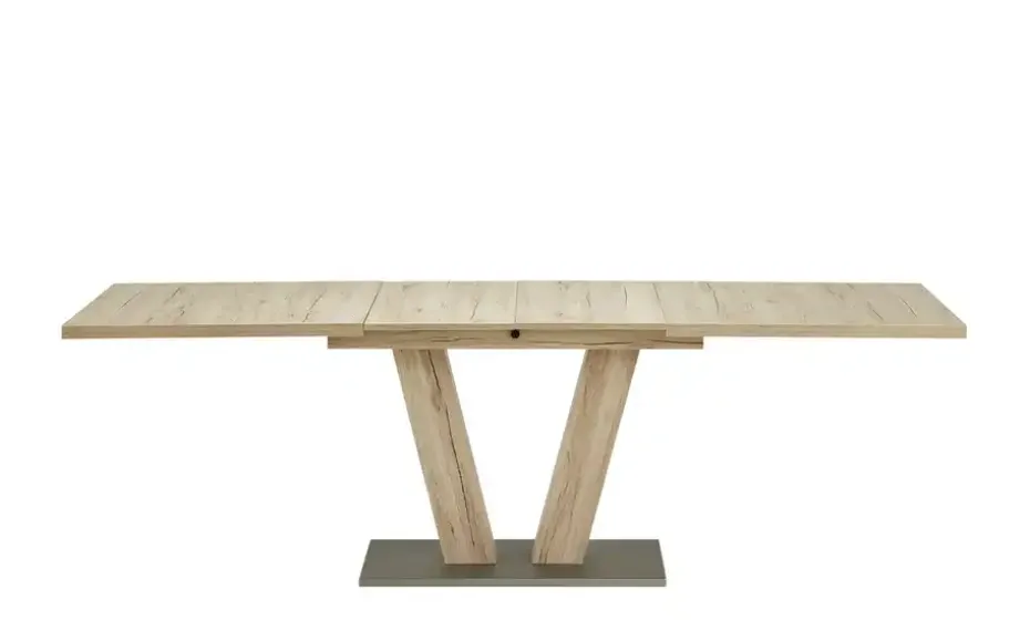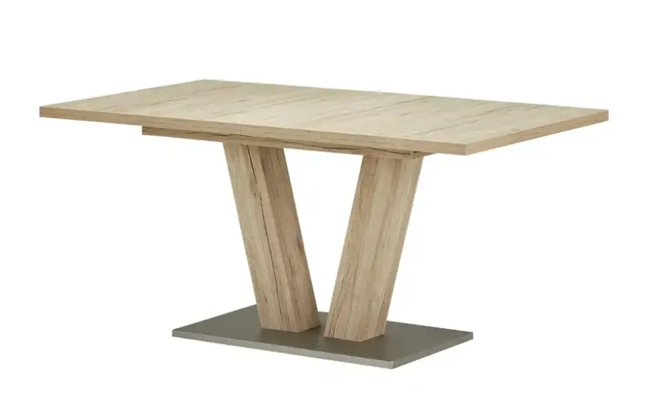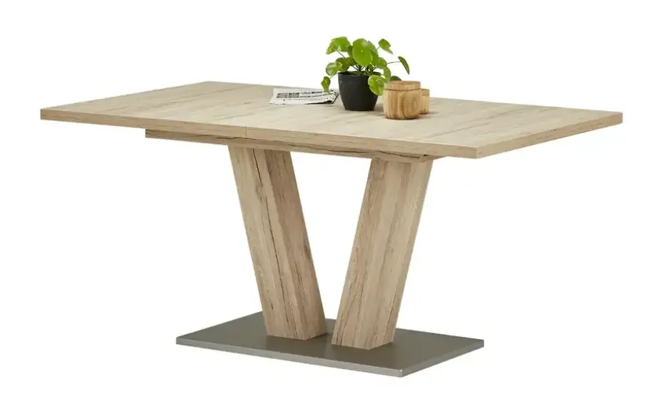 Und plötzlich kommen mehr Gäste als gedacht. Mit dem Esstisch 1063 finden Sie Platz für alle. Der Tisch kann bei Bedarf einfach ausgezogen und mit zwei Platten à 40 cm erweitert werden. So können bis zu zehn Personen bequem an ihm sitzen. Tischplatte und Gestell sind melaminbeschichtet. Das macht die Oberflächen besonders robust und pflegeleicht. Die Holzoptik (Nachbildung) sieht natürlich aus. Ein Eyecatcher ist das Gestell in V-Form.