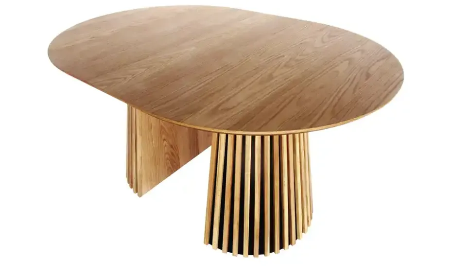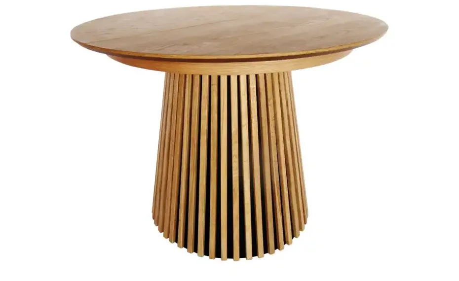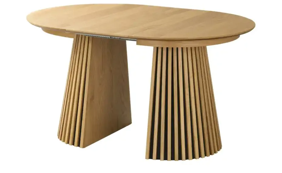 Dieser Säulentisch fällt durch seine stylische Lamellenoptik sofort auf. Holzleisten aus massiver Eiche umschmeicheln das Säulengestell und heben sich vom dunklen Untergrund ab. Die runde Tischplatte ist hochwertig furniert und nutzt dafür ebenfalls das natürliche Eichenholz. Ob als Eyecatcher im Wohnzimmer oder direkt in Küche oder Esszimmer: Dieser moderne Tisch macht überall eine gute Figur. Übrigens: die Tischplatte kann von 100 cm auf 140 Zentimeter erweitert werden. Dann passen statt vier Personen bis zu sechs Personen bequem an den Tisch.