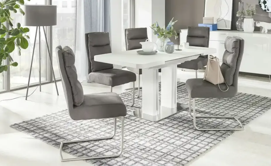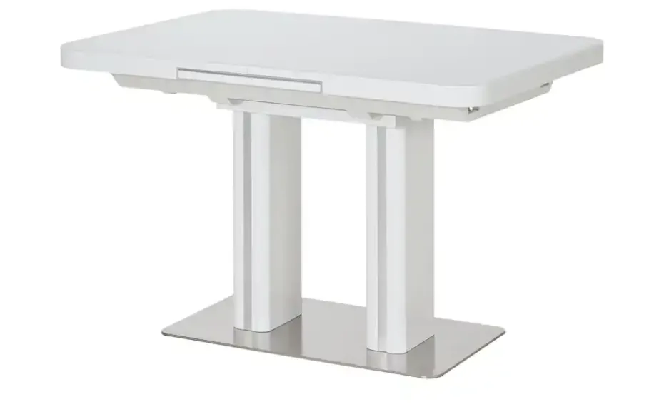 Modern und funktional: Der Esstisch Tizian in Weiß mit dekorativen Elementen in Edelstahl-Optik. Tizian ist ein ausziehbarer Esstisch und lässt sich durch den integrierten Mittelauszug kinderleicht auf 160 Zentimeter erweitern. Bei Bedarf bietet er dann Platz für bis zu acht Personen. Die weiße Tischplatte hat eine Glasoberfläche und lässt sich dadurch besonders einfach abwischen. Die beiden eckigen Säulentischbeine stehen auf einer Bodenplatte aus Edelstahl und sorgen für ein Plus an Stabilität. Tizian verleiht Ihrem Esszimmer ein modernes und leicht futuristisches Aussehen.