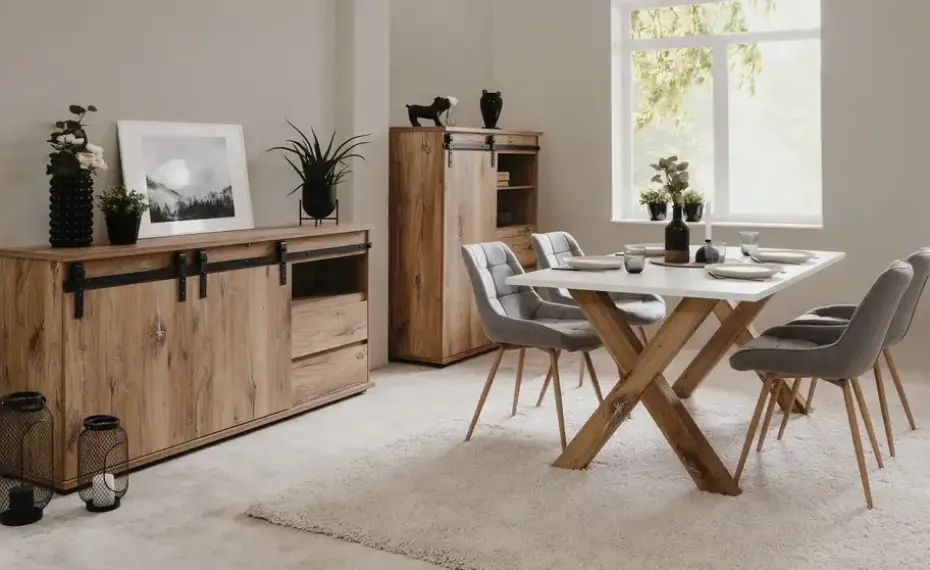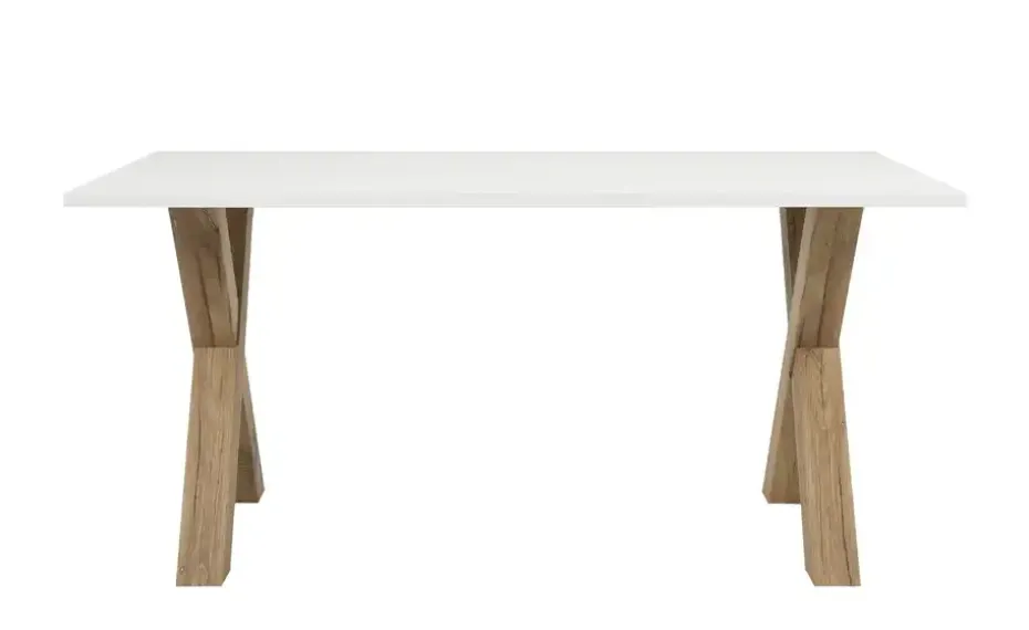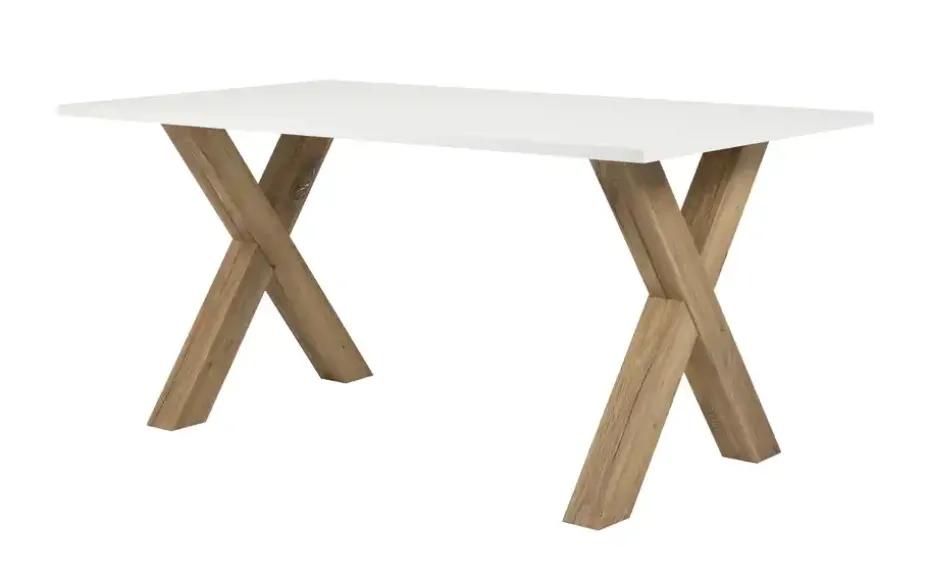 Der Esstisch Mangano besticht mit seinen auffälligen, x-förmigen Füßen. Sie besitzen eine attraktive Oberfläche in Eiche Antik (Nachbildung) und passen somit zur gleichnamigen Möbelserie. Die Kreuz-Füße tragen eine 90 x 160 Zentimeter große Tischplatte in Weiß, zu der Sie problemlos bunte Tischläufer und Platz-Sets kombinieren können.