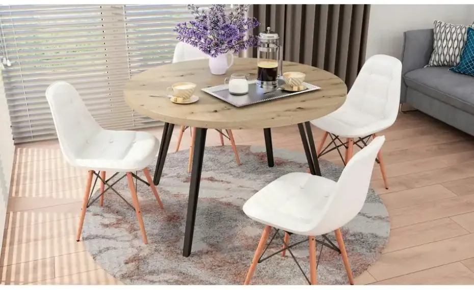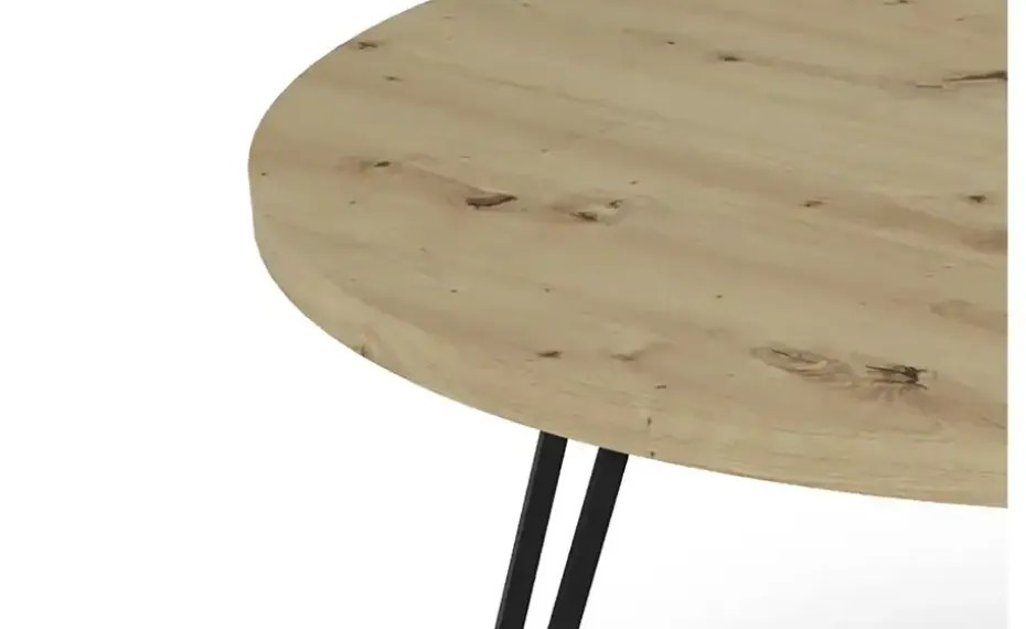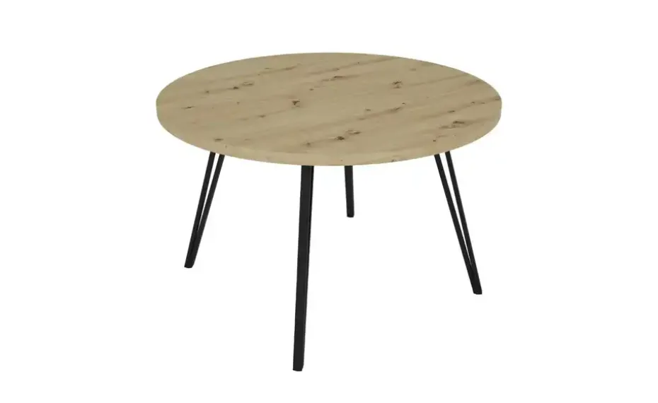 Durch das filigrane Haarnadelgestell aus Metall wirkt dieser runde Esstisch modern und leicht. Die Tischoberfläche überzeugt mit einer authentischen Nachbildung von Eiche Artisan, die wunderbar mit den schwarzen Füßen harmoniert. Bis zu fünf Stühle können an diesem Esstisch platziert werden.
