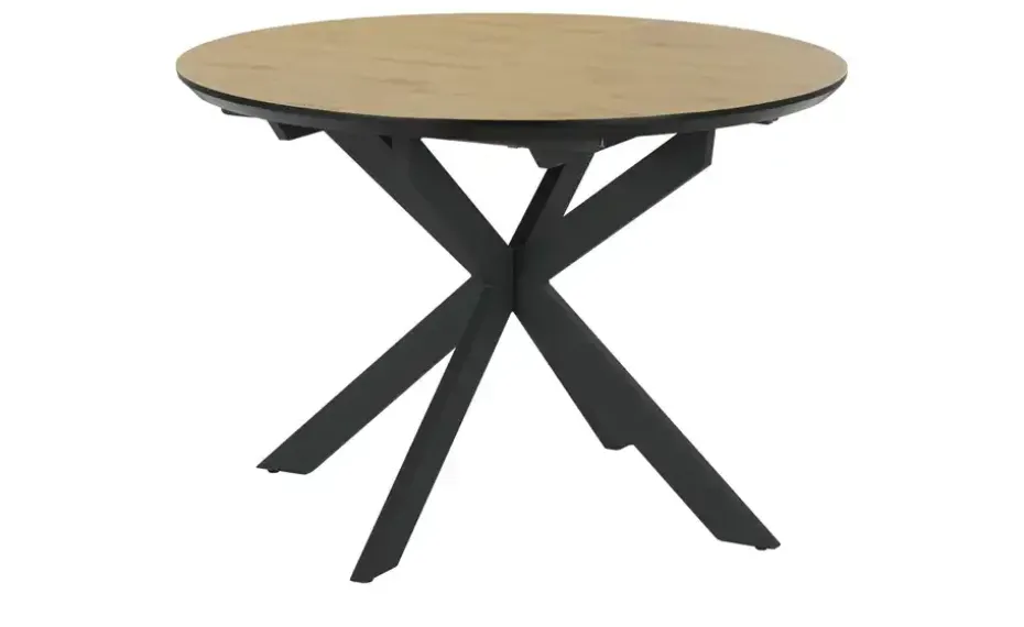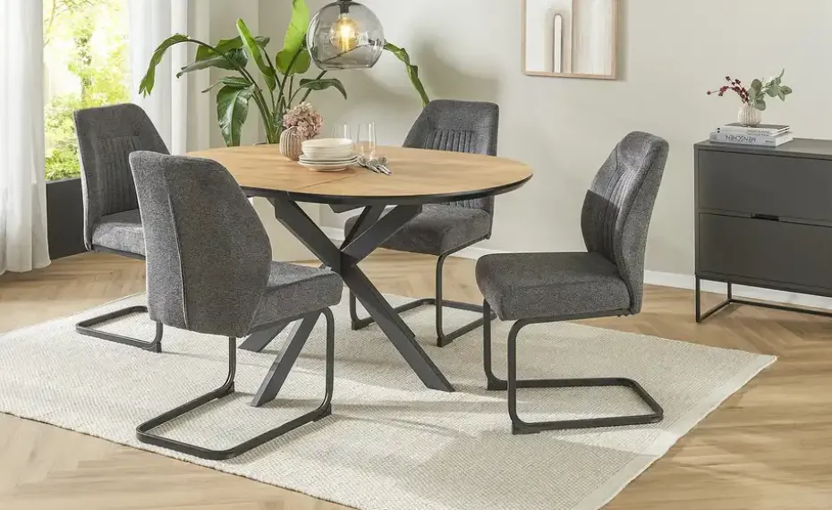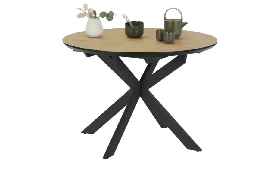 Dieser Esstisch verbindet robustes, schwarzes Metall und natürliche, freundliche Eichenoptik gekonnt. Das schwarze Sternengestell ist nicht nur optisch ein Hingucker, sondern sorgt auch für großzügige Beinfreiheit, egal, wo Sie sitzen. Die helle Tischplatte kommt durch die dunkle Schweizer Tischkante besonders gut zur Geltung. Ziehen Sie die 110 Zentimeter große Tischplatte bei Bedarf ganz einfach aus, dann können zwei weitere Personen an dem nun 150 Zentimeter langen Tisch platznehmen.