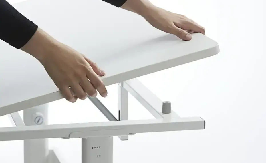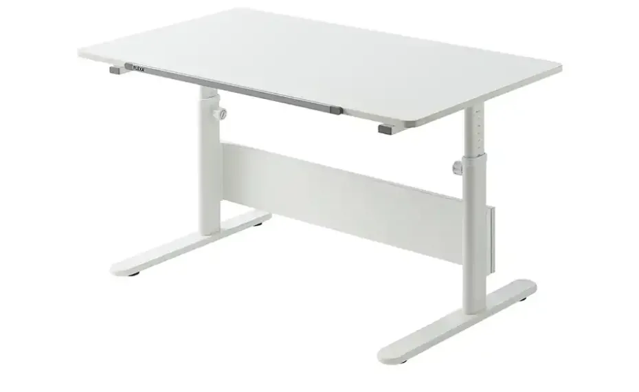 Der Schülerschreibtisch Evo von FLEXA lässt sich passend zur Größe des Kindes anpassen. So wächst er mit dem Kind mit und ermöglicht eine ergonomische Haltung beim Sitzen und Hausaufgaben machen. Die Höhe der Tischplatte wird mittels eines seitlichen Stellknopfes und eines Federsystems angepasst. Das ist von 56 bis 79 Zentimeter Höhe möglich. Auch die Neigung der Tischplatte ist leicht verstellbar. Durch einen Gasdruckdämpfer geht das kinderleicht. Ein Klemmlineal für die Tischplatte ist im Lieferumfang enthalten. Um den weißen Tisch etwas aufzupeppen, können Sie die mitgelieferten farbigen Kunststoffkappen nutzen. Sie werden vorne an den Tischbeinen befestigt.