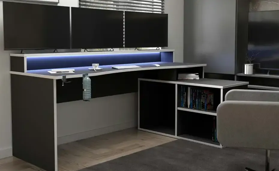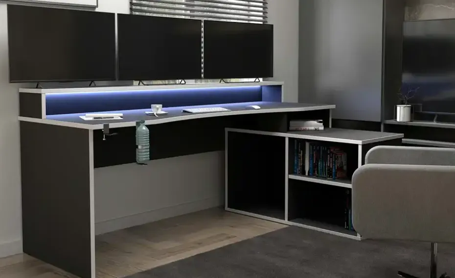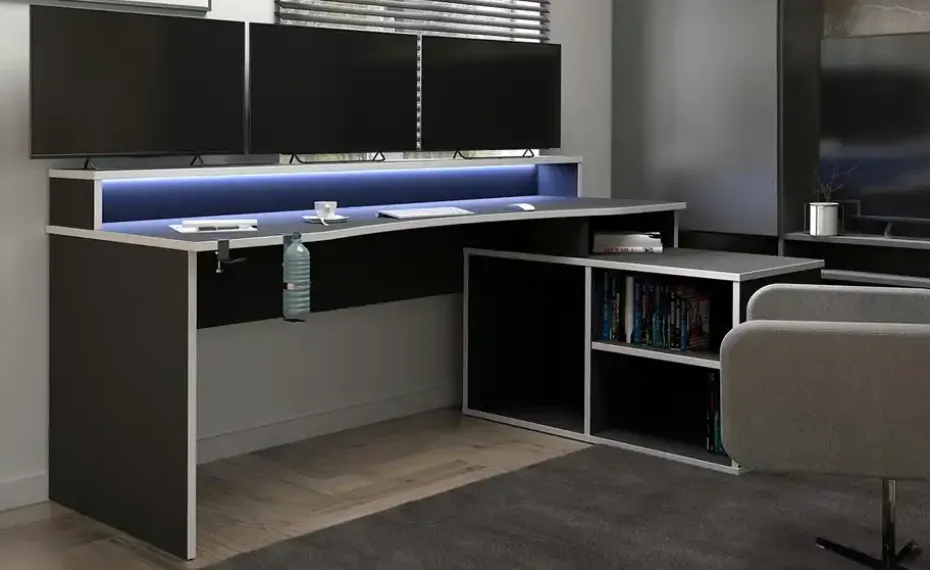 Beim Gaming-Ecktisch Zocker schlagen Gamerherzen höher: Der schwarze Schreibtisch ist mit weißen Highlights akzentuiert und zusätzlich mit einer LED-Beleuchtung ausgestattet. Die 200 cm große Tischplatte bietet großzügigen Platz für Gaming-Tastaturen und Konsolen. Auf der zweiten, schmaleren Ebene des Schreibtischs können Bildschirme, Lautsprecher oder Kamerazubehör aufgestellt werden. Praktischen Stauraum gibt es in den insgesamt 5 offenen Fächern. Durchdachtes Zubehör, wie die Kopfhörer-Aufhängung und der Getränkehalter runden den funktionalen Eck-Gamingtisch gekonnt ab.