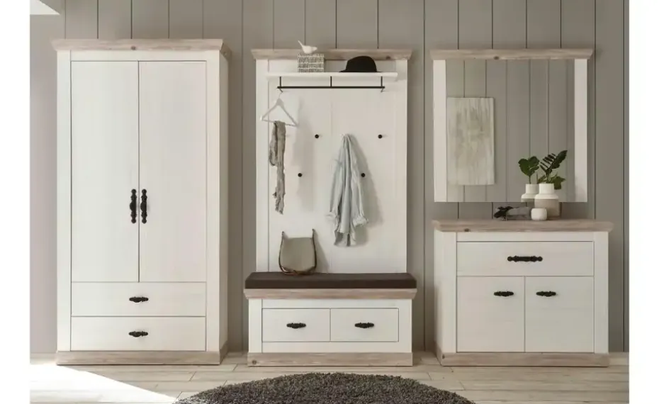 Set bestehend aus Schrank, Schuhschrank, Bank, Paneel und Spiegel