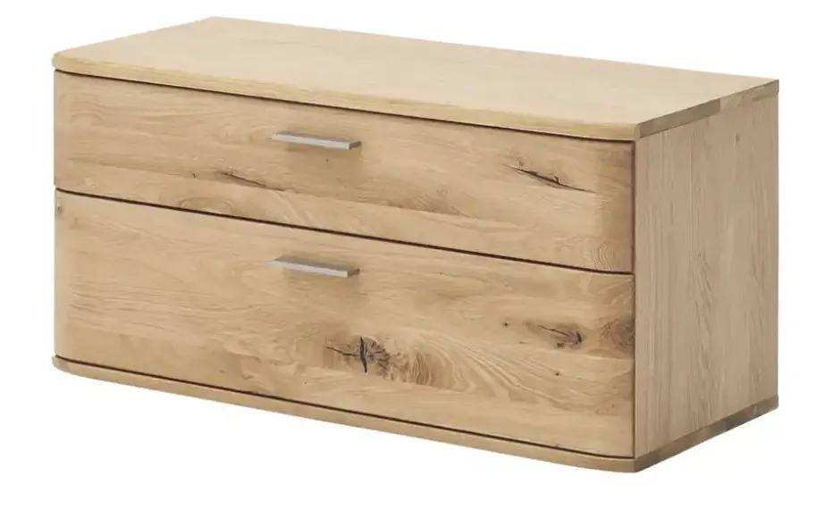 Mit der Garderobenbank Melle erhalten Sie Stauraum und eine Sitzgelegenheit für den Flur. Unterhalb der Sitzfläche ist Melle mit zwei Schubladen ausgestattet, wobei die untere etwas größer als die obere ist. Beide erstrecken sich über die gesamte Breite der Bank. Durch die Soft-Close Ausstattung schließen die beiden Schübe langsam und geräuscharm. Sitzfläche und Seiten sind mit Eiche Bianco furniert, die Front hingegen besteht aus massiver Balkeneiche Bianco. Um die Oberfläche zu versiegeln, ist das Holz mit einem Öl behandelt worden.