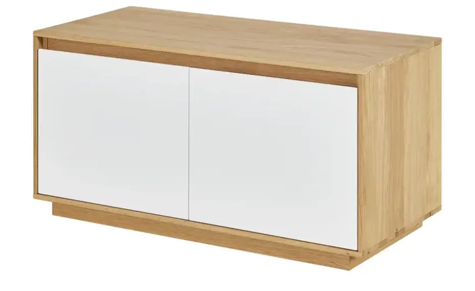 Die Garderobenbank Tiba ist gleich doppelt praktisch: Sie ist Stauraum und Sitzgelegenheit in einem. Innen verfügt Tiba über zwei Fächer. Der Einlegeboden dazwischen lässt sich in der Höhe variieren. Nutzen Sie den Stauraum zum Beispiel für Schuhe. Durch die Türen sind sie vor Staub geschützt. Tiba sieht auch ansprechend aus. Der furnierte Korpus in Eiche Bianco wird von einer weißen Front abgesetzt.