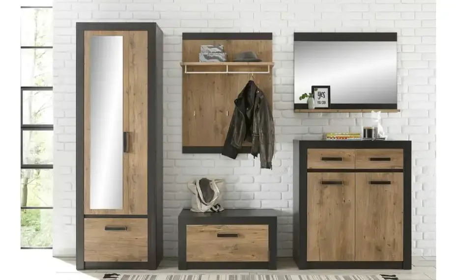 Set bestehend aus Schrank, Schuhschrank, Bank, Spiegel und Paneel