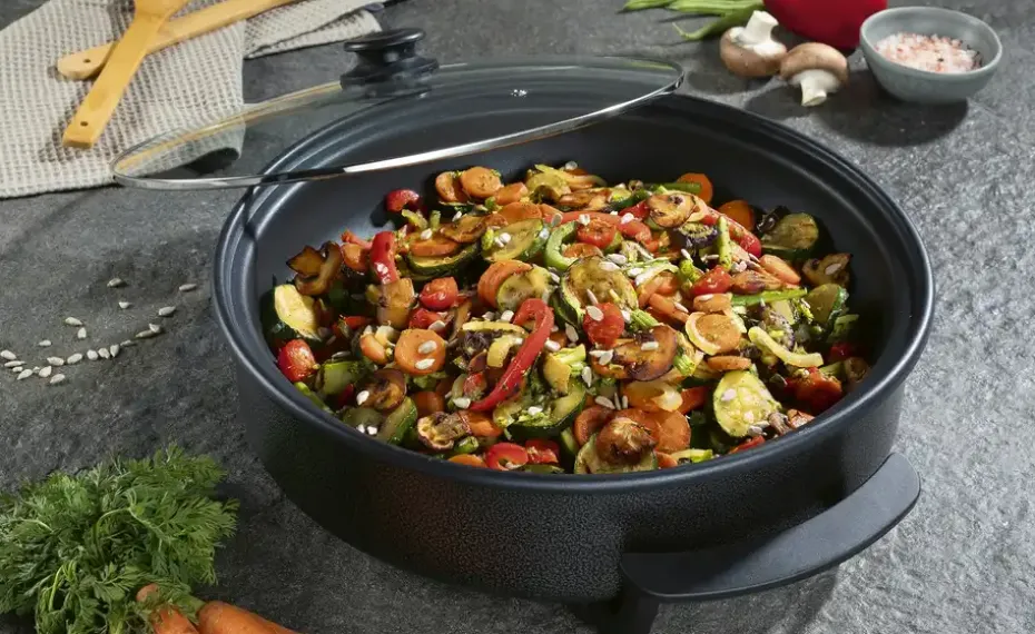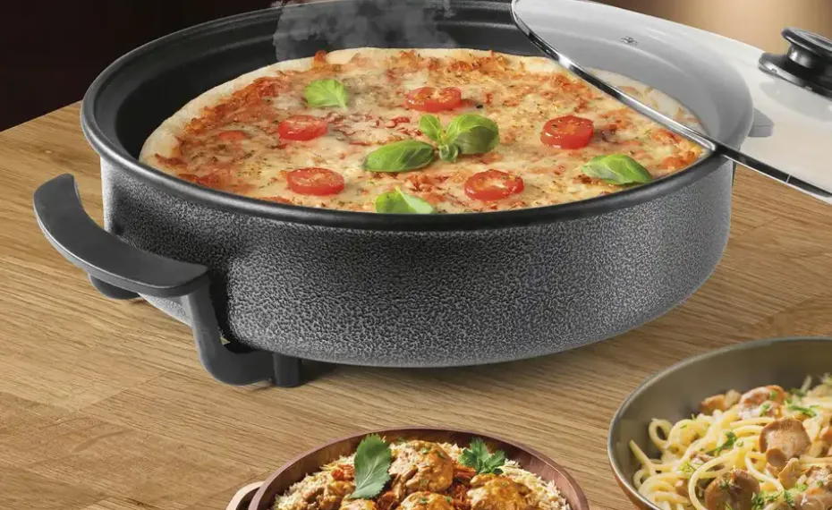 Multifunktionspfanne – zum Pizza backen, Braten, Grillen, Kochen, Schmoren , Dünsten, Garen, uv,.