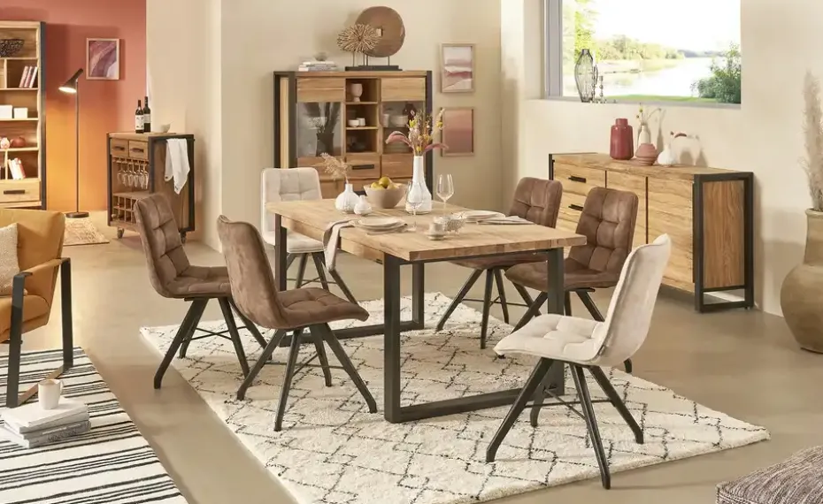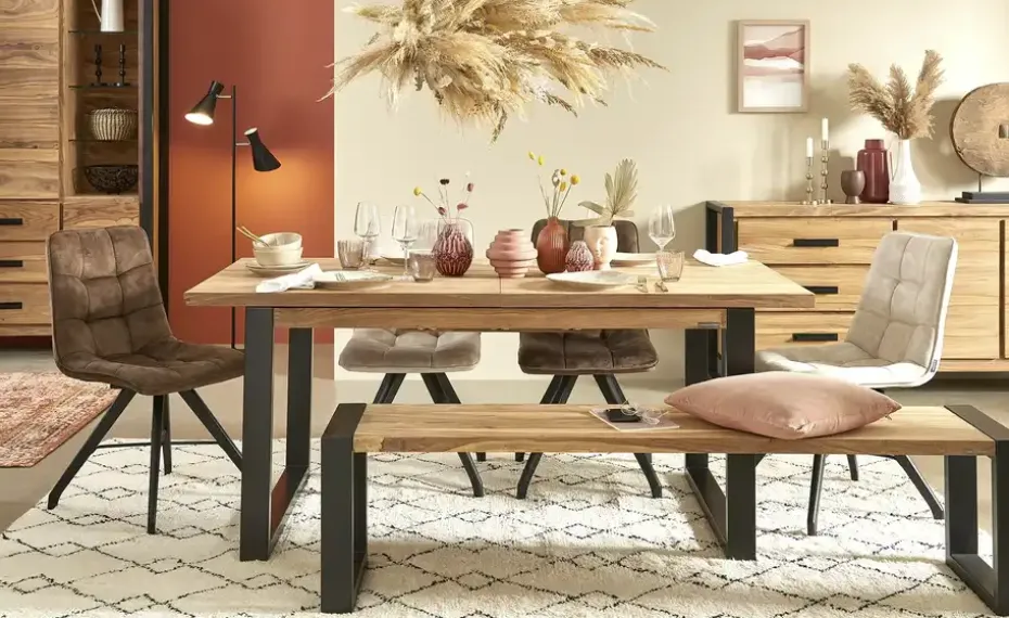Im Esszimmer brauchen nicht immer Stühle stehen. Eine tolle Alternative: Bänke. So wie die hochwertige Bank Tierra Fuego One von der Marke Gray & Jones. Sie ist ganze 180 Zentimeter breit und kann somit einen Sitzplatz für mindestens drei Personen bieten. Für die Sitzfläche ist hochwertiges Sheeshamfurnier verwendet worden. Es zeichnet sich durch seine stark ausgeprägte Maserung aus, die alle Blicke auf sich zieht. Als Kontrast dient – und für den guten Stand sorgt – das Gestell. Es besteht aus zwei schwarzen Eisenkufen. Ihre Oberfläche ist Schwarz lackiert worden.