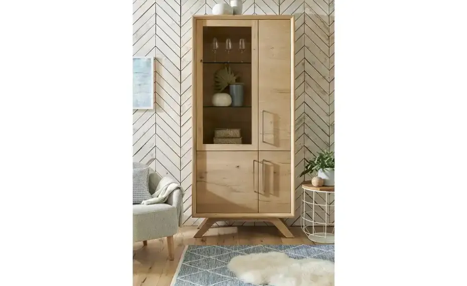 Elegant, skandinavisch-modern und natürlich zugleich – das ist die Vitrine Cap Ferrat One von Gray & Jones. Sie hat Oberflächen aus Eichenfurnier, das mit einer natürlichen Maserung und hellen Farbe punktet. Das Holz ist bewusst unbehandelt belassen worden. Akzente werden durch die gebürsteten Metallgriffe gesetzt. Die obere linke Tür wird mit Glas abgesetzt, damit Sie einen freien Blick in die Fächer erhalten. Sie lässt sich mit Push-to-Open Funktion öffnen. Weiterer vielseitiger Stauraum befindet sich hinter den anderen drei Türen. Eine integrierte Soft-Close-Funktion sorgt für ein geräuscharmes Schließen.