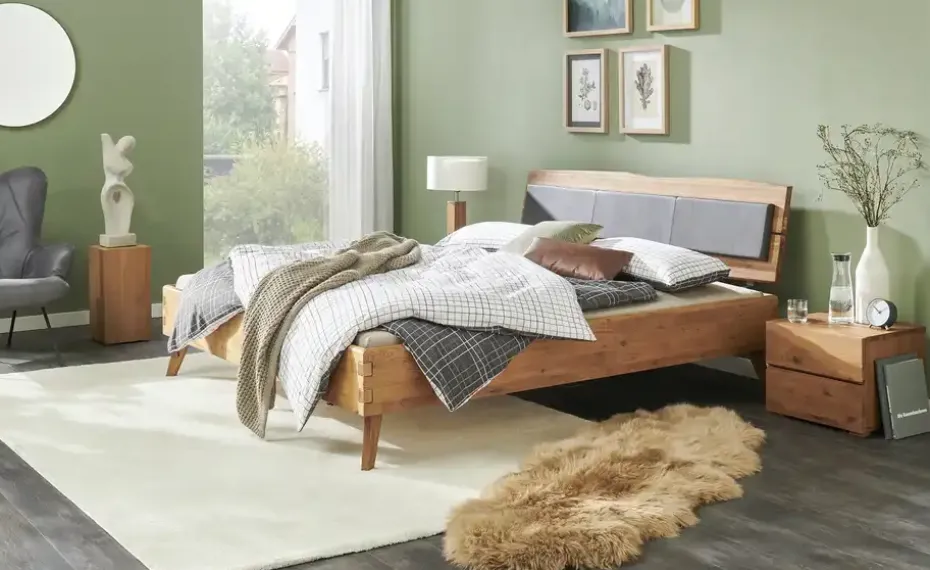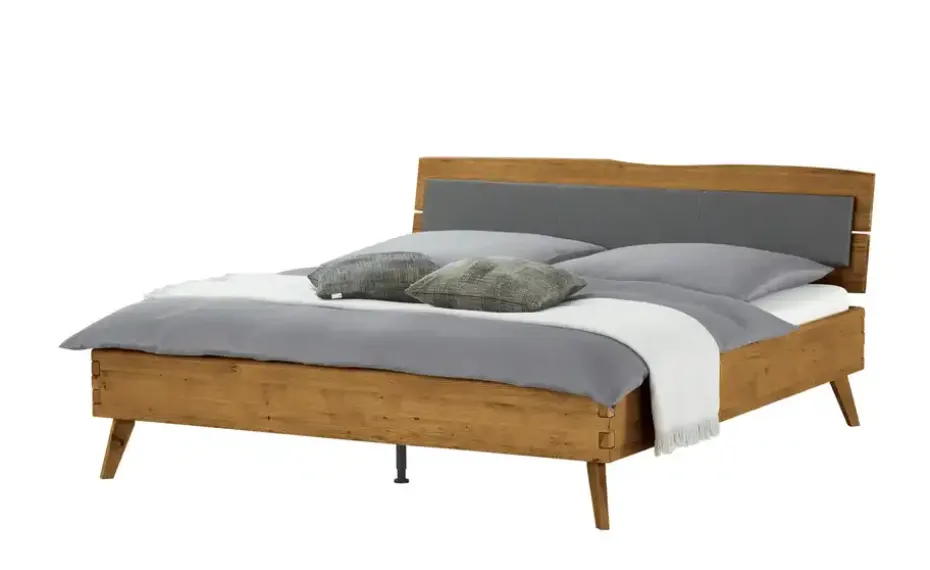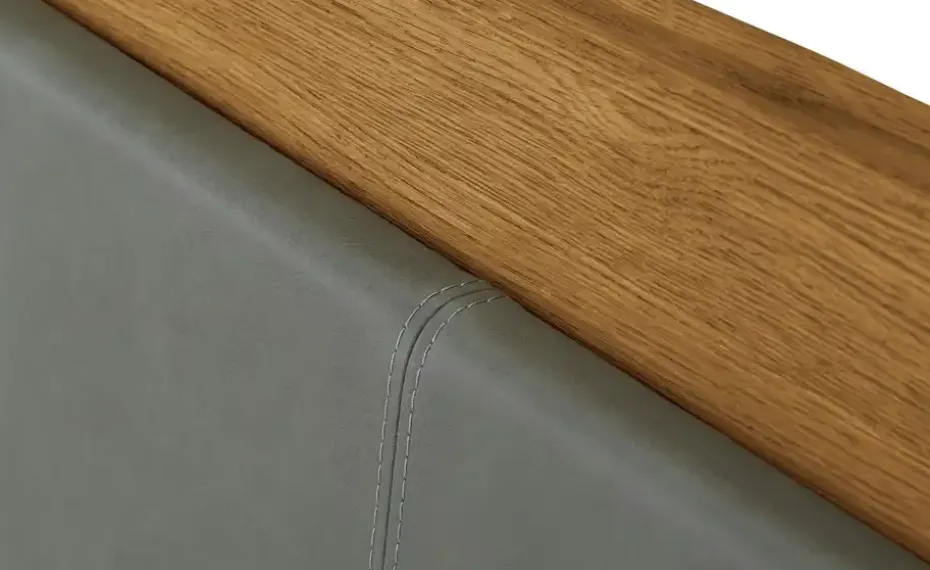 Für das Bettgestell Bivio wurde echtes Eichenmassivholz verwendet. Eine schöne Holzmaserung, Asteinschlüsse und eine attraktive Reliefoberfläche machen daher den Charakter des Bettes aus. Bewusst gesetzte Highlights an den Bettecken und die schräg zulaufenden Füße betonen das natürliche Design. Auch die Baumkante am Kopfteil setzt Akzente. Kontrast und moderner Eyecatcher ist das graue Kopfteilpolster. Dezente Ziernähte unterteilen hier den pflegeleichten Kunstlederbezug in drei Bereiche. Hier können Sie sich anlehnen und den Abend entspannt ausklingen lassen. Das Massivholz-Bettgestell Bivio ist mit handelsüblichen Lattenrosten kombinierbar und kann mit Ihren vorhandenen Matratzen ergänzt werden. Dank der vierfach verstellbaren Einlegetiefe bestimmen Sie, wie Sie am besten schlafen.