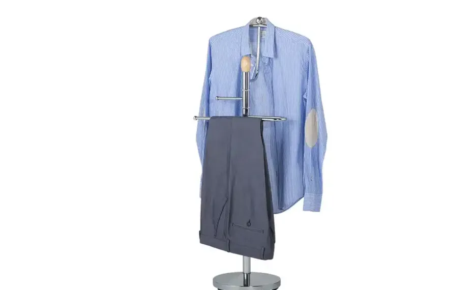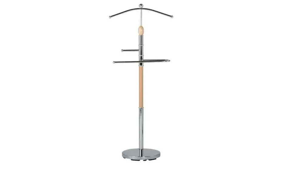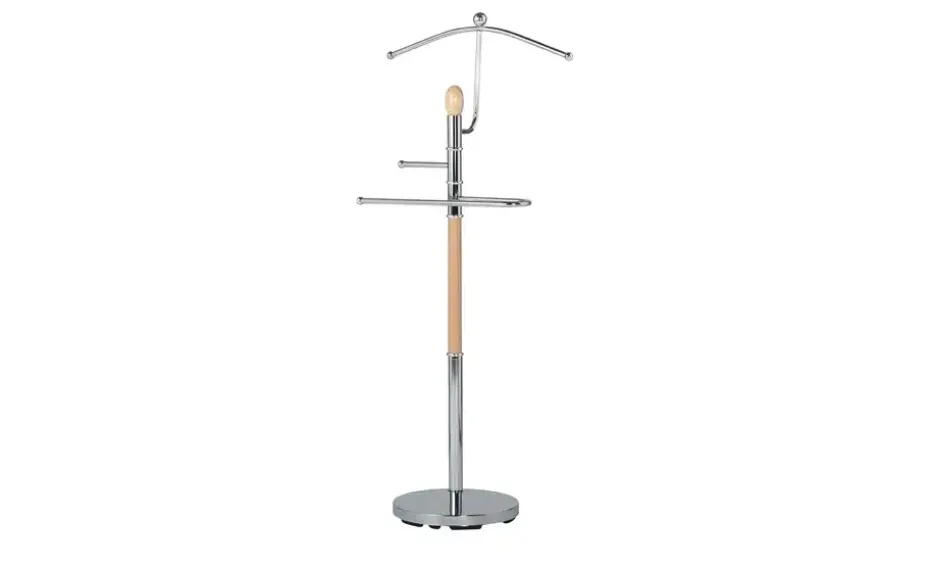 Ein schickes Wohnaccessoire holen Sie sich mit diesem Herrendiener in Ihr Zuhause. Durch die Kombination von holz- und chromfarbenen Elementen wirkt er elegant und zugleich zeitlos. Sie können an ihm bequem Ihre Hemden und Hosen aufhängen. Die Spitze bietet zudem Platz für Sakkos oder Jacken.