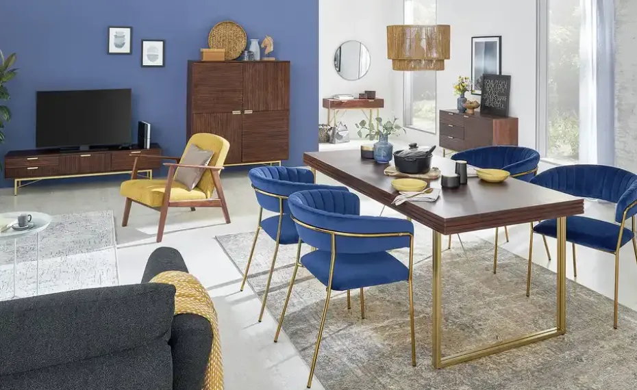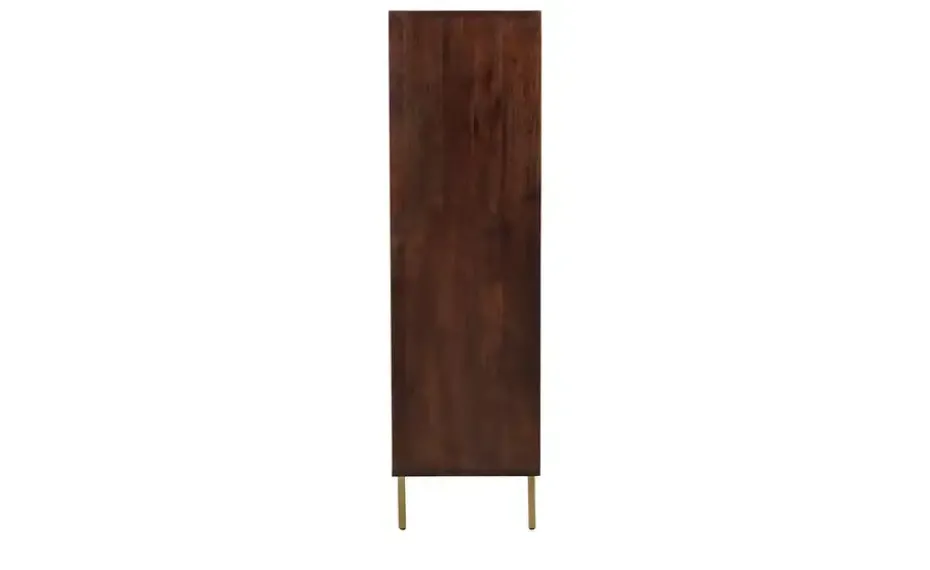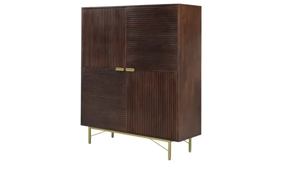 Dunkle Akazie und edle, goldfarbene Akzente: Das sind die Markenzeichen der Serie Dorado. Die Fronten der vier Türen sind mit einem attraktiven Relief verziert. Dahinter steht Ihnen praktischer Stauraum in Form von acht Fächern zur Verfügung. Getragen wird das Highboard von einem goldfarbenen Gestell, das wunderbar mit dem Akazienholz harmoniert. Unser Tipp: Bleiben Sie dem Stil treu und ergänzen Sie Ihr Wohnzimmer mit dem gleichnamigen Sideboard oder dem TV-Lowboard der Serie.