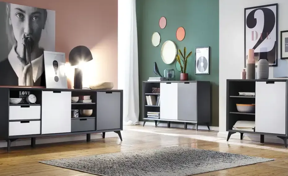 Das moderne Highboard bietet verschiedene Optiken und Farbkombinationen durch das Drehen und Umplatzieren der Ausstattung